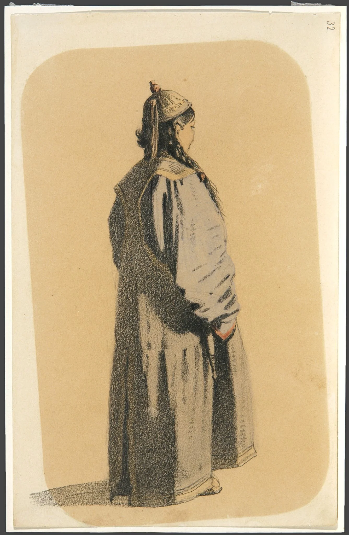 Oirat Woman in National Costume (Late 19th Century): A detailed study of traditional silhouettes and ornamentation, capturing the elegance and structure of the historical Oirat dress.