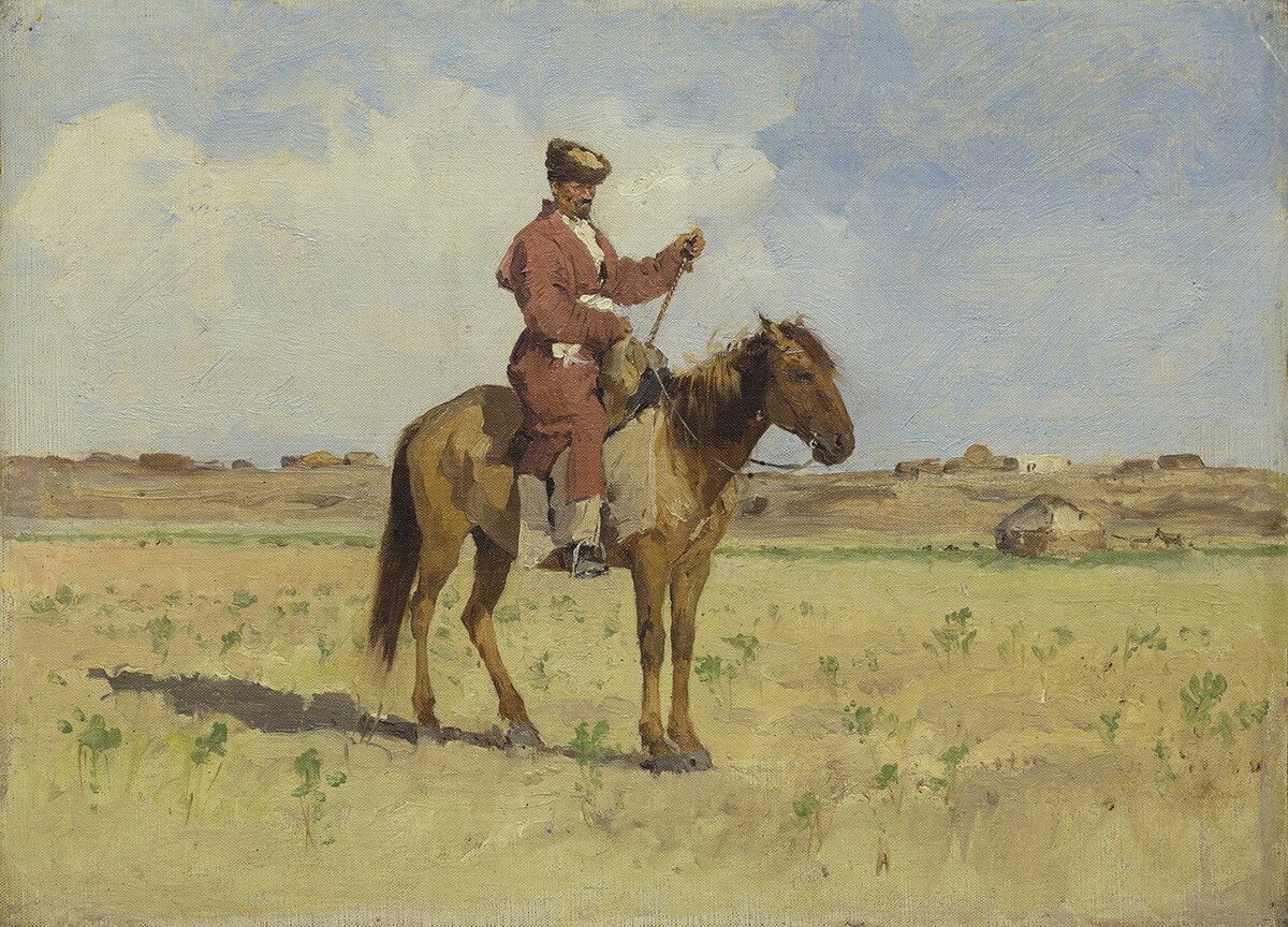 Kalmyk on a Horse in the Steppe (1869–1870): A quintessential image of nomadic life, emphasizing the inseparable bond between the Kalmyk person, their horse, and the vast Eurasian plains.